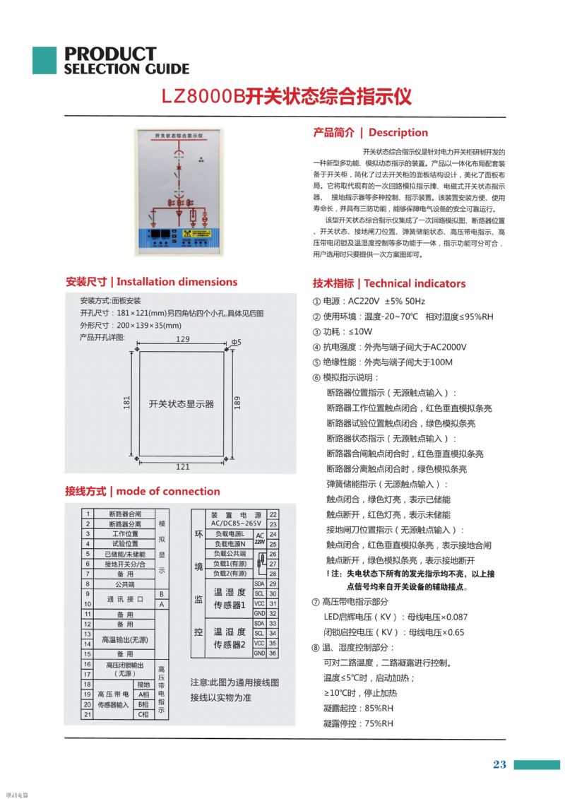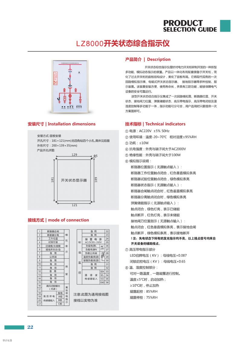 TL-6200開關(guān)狀態(tài)綜合指示儀產(chǎn)品集成了一次回路模擬圖、斷路器位置、開狀態(tài)、接地閘刀位置、彈簧儲(chǔ)能狀態(tài)、高壓帶電指示、高壓帶電磁閉鎖及溫、濕度控制等多功能于一體,用戶選用時(shí)只需提一次方案圖即可。本產(chǎn)品將取代現(xiàn)有的一次回路模擬指示牌、磁式開關(guān)狀態(tài)指示器、接地指示器等多種控制、指示裝置。如戶選配通訊功能