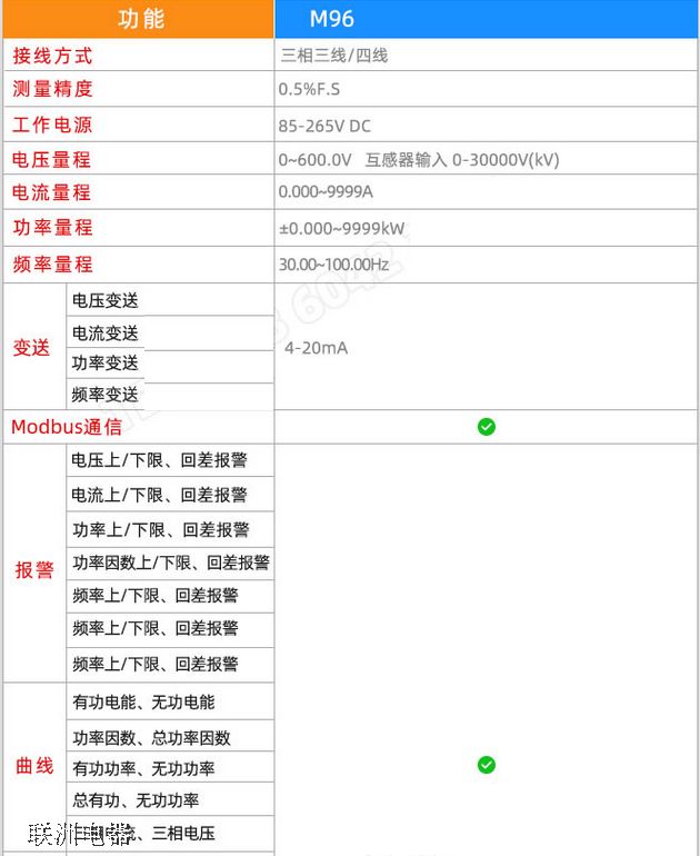 M96三相多功能電力儀表,采用7寸彩色觸控屏+按鍵操作,可三相三線/四線切換了,具備電流、電壓、頻率、功率、四象限電能、有功功率、無功功率、功率因數(shù)、采樣波形、諧波分析等多種電能值測量和統(tǒng)計。具備1-3報警輸出或mA電流變送輸出,支持modbus通信協(xié)議。