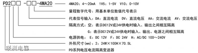 PD2E/PD2F/PD2H系列電壓電流隔離變送器型號說明: