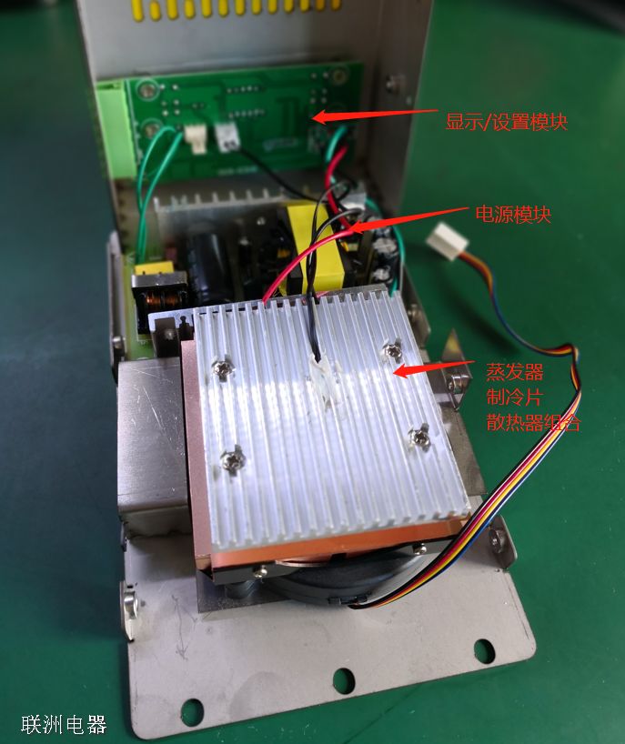 由風扇將含濕量較大的空氣吸入除濕裝置內,在流經低溫的蒸發器時,空氣中的一部分水蒸氣在蒸發器表面凝結成水珠析出。在蒸發器下部設有集水盤,將冷凝水收集起來流入排水管并向室外排出。蒸發器一般是像散熱器一樣的鋁板,下部緊貼半導體制冷片,制冷片工作時會將蒸發器的熱量吸走,從而使其溫度降低。與制冷片連接的是散熱專用的散熱器和風扇。