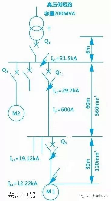 電動機M1、M2均為輕載起動,ICL=600A,試選用各級斷路器。選用前對各級故障點進行了短路電流計算,計算結果為IK1=31.5kA,Ik2=29.7kA,Ik3=19.12kA,Ik4=12.22kA,末端單相對地短路電流I´k4=4.9kA。