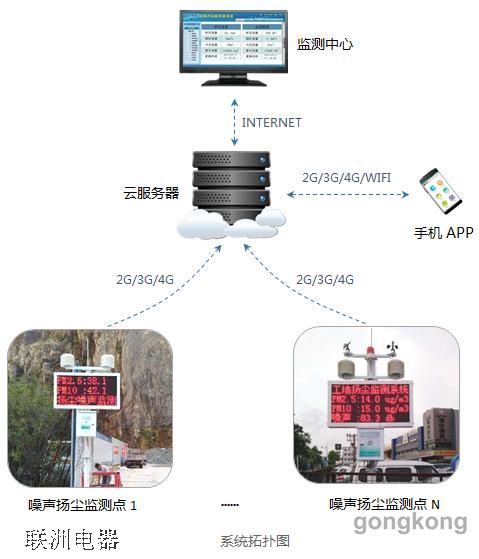 現場設備:顆粒物濃度傳感器、噪聲傳感器、氣象傳感器、LED屏、噪聲揚塵監測終端等。