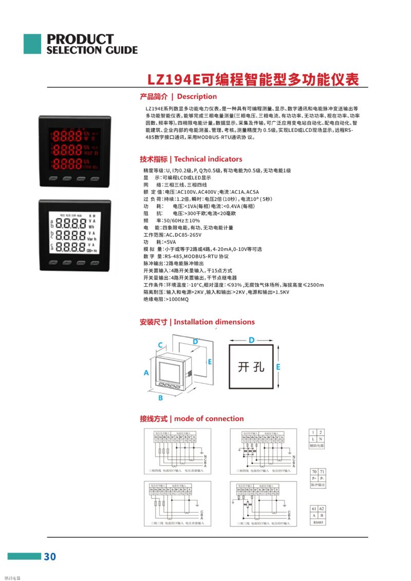 APD194E-AS4多功能儀表多功能電力儀表是一種具有可編程測量、顯示、數(shù)字通訊和電能脈沖輸出等功能的多功能電力儀表,能夠完成電量測量、電能計量、數(shù)據(jù)顯示、采集及傳輸,能夠高精度測量三相電網(wǎng)系統(tǒng)中常用的電量參數(shù):三相電流、電壓、電流、總有功功率、總無功功率、功率因數(shù)、總視在功率、頻率、分相有/無功功率、分相功率因數(shù)、 有功電能、無功電能,并帶有通訊接口,可實現(xiàn)本地或遠(yuǎn)程的開關(guān)信號檢測和控制功能。采用標(biāo)準(zhǔn)的 RS485 MODBUS-RTU通訊協(xié)議 , 實現(xiàn)LED/LCD現(xiàn)場顯示和遠(yuǎn)程RS-485數(shù)字通訊。