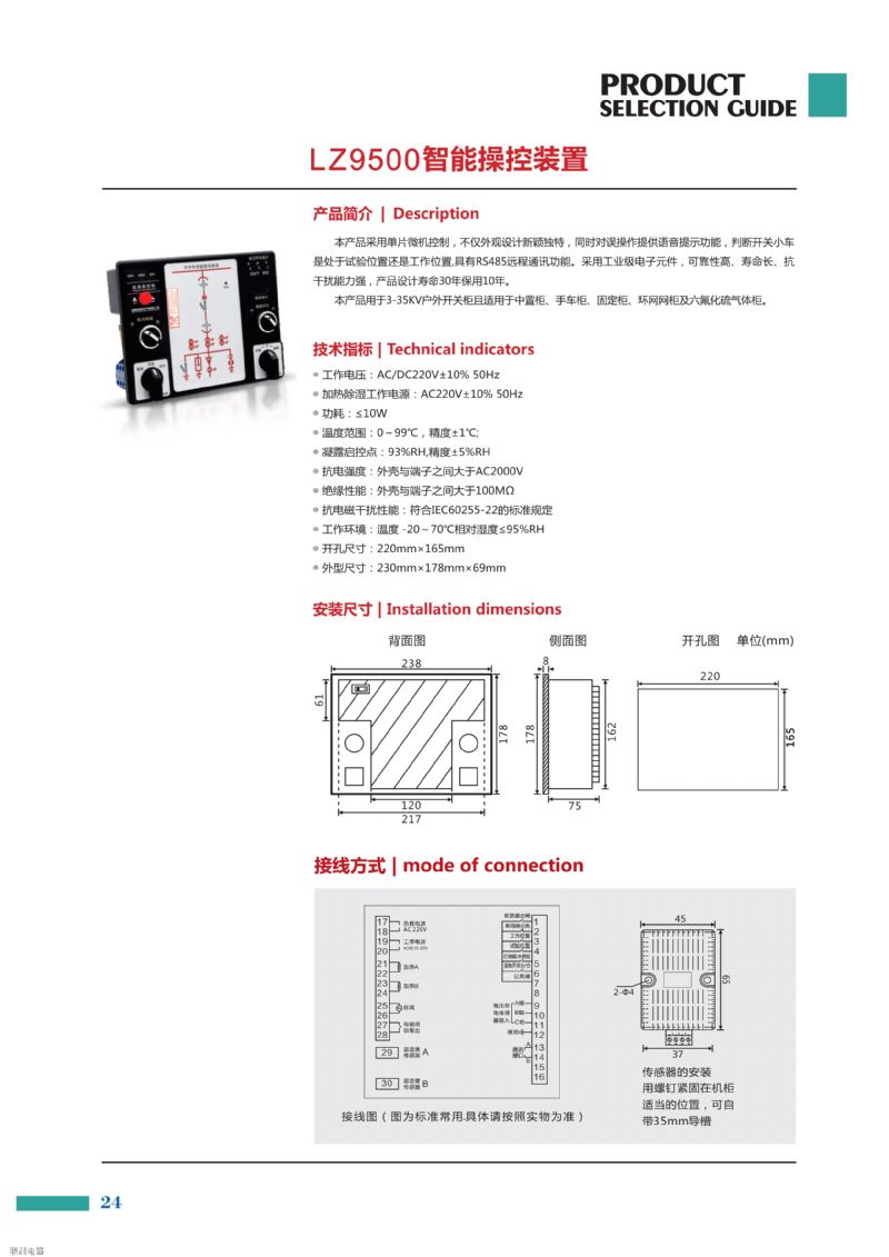 BH9500開關柜智能操控裝置智能化采用32位微處理器控制,與常規的開關柜狀態顯示儀相比,具有高速運算、高速采樣、快速響應、更加實時。設備可顯示開關分合狀態,還可判斷開關小車是否處于試驗位置與工作位置之間;此外設備具有溫濕度傳感器過壓過流保護,對于工業場合應用,更加可靠穩定。可靠性及抗干擾采用工業級電子元件,具有可靠性高、壽命長、抗干擾能力強等特點。發光模塊采用進口發光芯片,戶外高亮級,壽命 170000小時;采用獨特的抗干擾技術,保證設備可靠運行。二技術指標環境溫度: -40℃~80℃ (±0.5℃)相對濕度: 0~99%RH (±3%RH)介質強度: ≥AC2000V絕緣性能: ≥100MΩ抗電磁干擾功能: 符合IE C255-22的標準規定工作電源:DC110V, DC220V, AC220V (三種可選)通訊方式:RS485(選配)功耗:≤10W開孔尺寸:120(長) X 180(寬) X 50(深)mm 主要功能說明 動態顯示 斷路器狀態顯示斷路器合閘并且分閘回路完好時,紅色01模擬條發光。斷路器分閘并且合閘回路完好時,綠色02模擬條發光