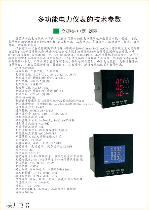 測量:三相電壓、電流、有功功率、無功功率、功率因數(shù)、率、有功電能、無功電能尖、峰、平、谷四種裁率計量具備測測量2-31次諧波分析采用高可靠性工業(yè)級DSP,數(shù)據(jù)采集速度快,測量精度高,運算處理速度強大的數(shù)據(jù)采和處理功能,可實現(xiàn)一個回路全電氣的測量・體積小,安裝方便,采用自鎖面板式安裝機構,無需螺絲固定即可安裝,・接線方便靈活,三相三線制、三相四線制可通過面板編程設置可選配1路RS485通訊口( Modbus通信協(xié)議),與其他設備進行聯(lián)網(wǎng)通信可選配1~4路4~20mA的模擬量輸出和1~4路開關量輸入輸出