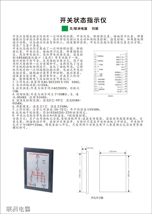 開關狀態指示儀產品集成了一次回路模擬圖、斷路器位置、開關狀態、接地閘刀位置、彈簧儲能狀態、高壓帶電指示、高壓帶電電磁閉鎖及溫、濕度控制等多功能于一體,用戶選用時只需提供一次方案圖即可。本產品將取代現有的一次回路模擬指示牌、電磁式開關狀態指示器、接地指示器等多種控制、指示裝置。如用戶選配通訊功能,還可將所有開關狀態和溫濕度情況上傳至監控中心。