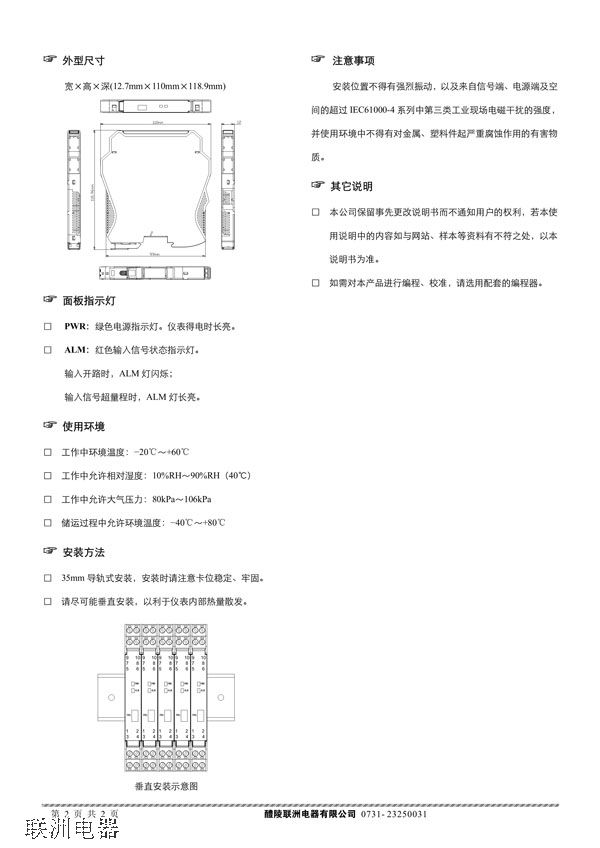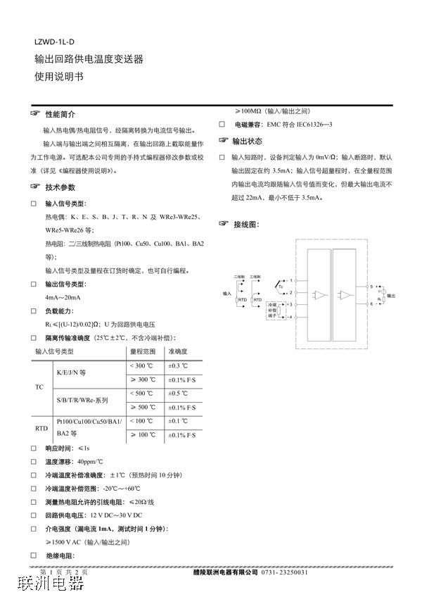 輸入熱電偶/熱電阻信號,經隔離轉換為電流信號輸出。 輸入端與輸出端之間相互隔離,在輸出回路上截取能量作為工作電源。可選配本公司專用的手持式編程器修改參數或校 準(詳見《編程器使用說明》)。