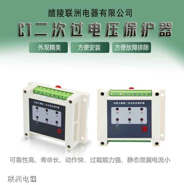 電流互感器(CT)在電力系統中,廣泛用于一次測量與控制。電流互感器的二次側近似短路狀態,輸出極小的電壓。運行中如果二次側開路,或一次側繞組流過異常電流(如雷電流、諧振電流、電感啟動電流、電容充電電流等),都會在二次側產生數干伏甚至上萬伏的過電壓。這不僅給二次側系統絕綠造成危害,還會使電流互感器過激而燒毀,甚至危機工作人員的生命安全。電流互感器保器是多回路保護器。安裝于開關柜二次導軌上。保器本身有復位按鈕,有遠程復位端子(J1、J2)可以延伸到操作部位,保護輸出的同時有繼電器的閉合觸點輸出(K1、K2)可以用于自動化連鎖。