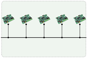 信息在一條公共通道上傳輸,信息接收者從通道上接收所有信息,并根據規則過濾發送給自己的信息。連線少,結構清晰,僅需≤n+1根線。