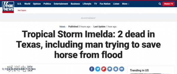 據(jù)美國福克斯新聞(Fox News)報(bào)道,2019年9月19日,受到熱帶風(fēng)暴“伊梅爾達(dá)”(Imelda)影響,美國得克薩斯州遭暴雨襲擊,街道積水,一名男子因救自己的愛馬而觸電身亡。