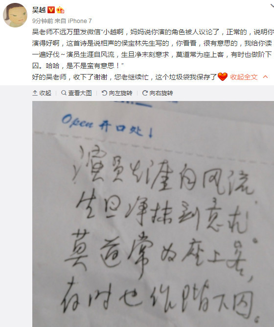 就在這幾天,2017年7月12日,因為在《我的前半生》中飾演“小三”被罵到關了微博評論的吳越發文,稱“吳老師”開導因角色被罵的自己,讀了一首侯寶林先生寫的詩“演員生涯自風流,生旦凈末刻意求,莫道常為座上客,有時也做階下囚”。