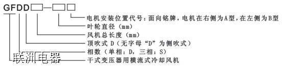 例:風(fēng)機(jī)型號(hào)為GFDD470-120A,表示工作電壓?jiǎn)蜗?20V、風(fēng)機(jī)總長(zhǎng)為470mm,葉輪直徑為120mm,電機(jī)安裝在右側(cè)的頂吹式干式變壓器用橫流式冷卻風(fēng)機(jī)。